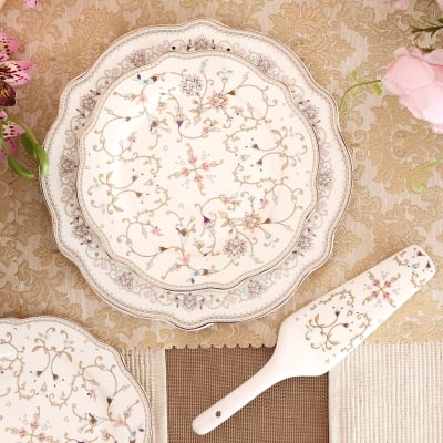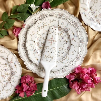 White Pattern 8 Pcs Snack Set (1 Dinner Plate, 6 Quarter Plates, 1 Server)