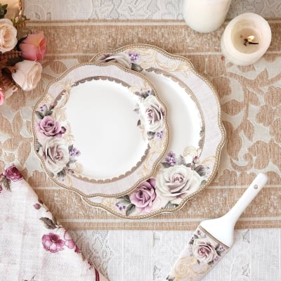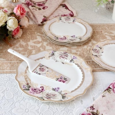 Gold Roses 8 Pcs Snack Set (1 Serving Plate, 6 Quarter Plates, 1 Server)