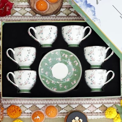 Victorian Green Cup and Saucer Set (6 Cups and 6 Saucers)
