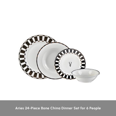 Aries 24-Piece Bone China Dinner Set for 6 People, Black White