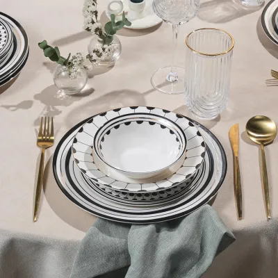 Gem 24-Piece Bone China Dinner Set for 6 People, Black Gold White